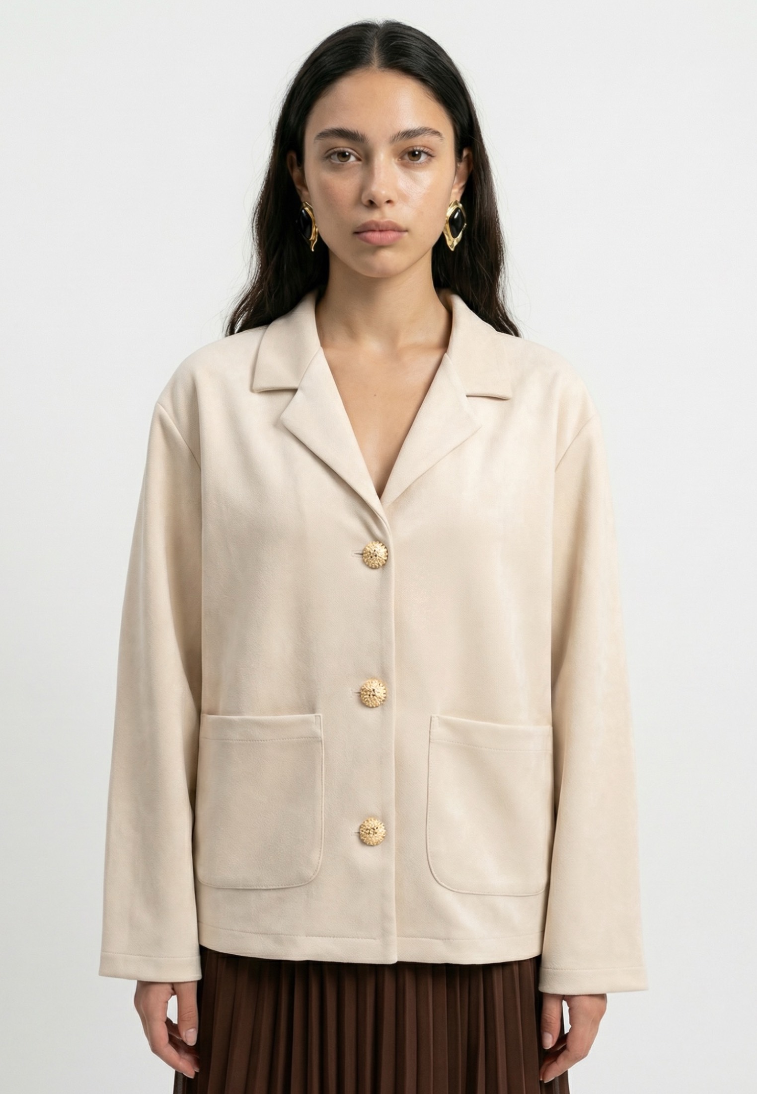 Блейзер из мягкой экозамши молочного оттенка. Модель прямого силуэта с мягкой линией плеча и аккуратным английским воротником.