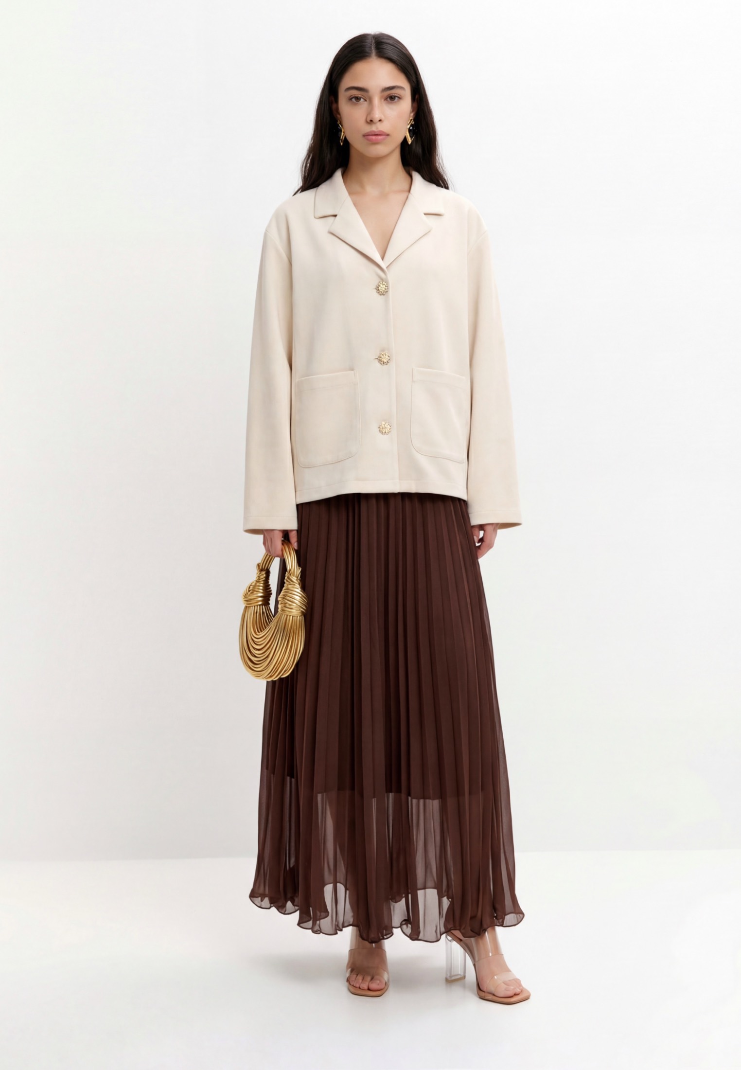 Изделие дополнено центральной застёжкой на декоративные пуговицы и накладными карманами, поддерживающими лаконичную архитектуру модели.