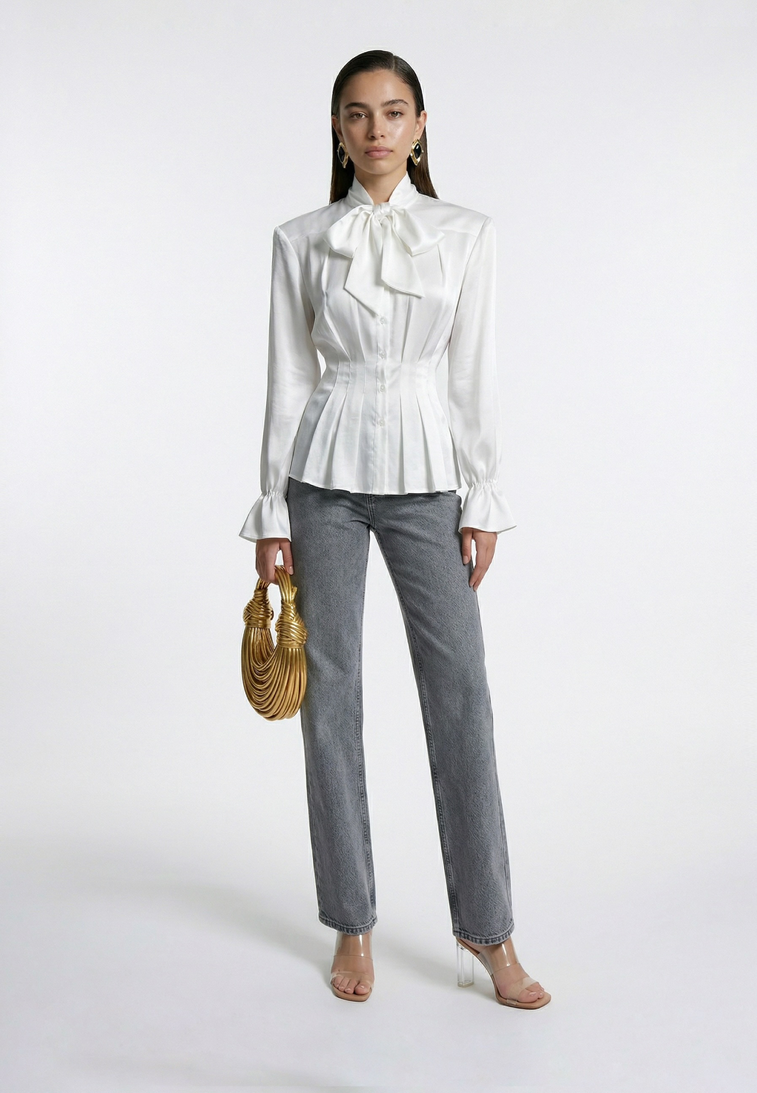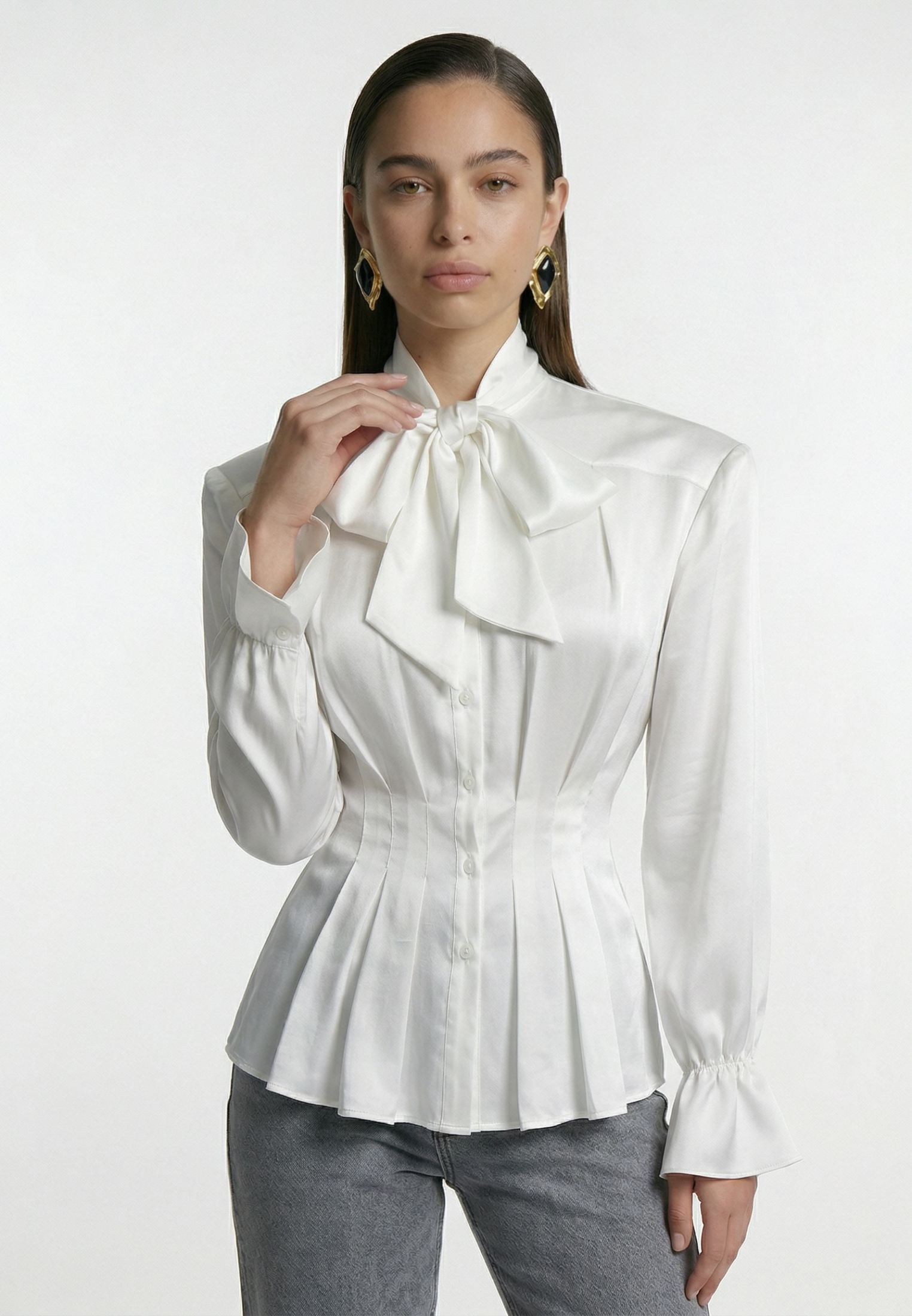 Блузка в белом оттенке с удлинёнными завязками у горловины.
