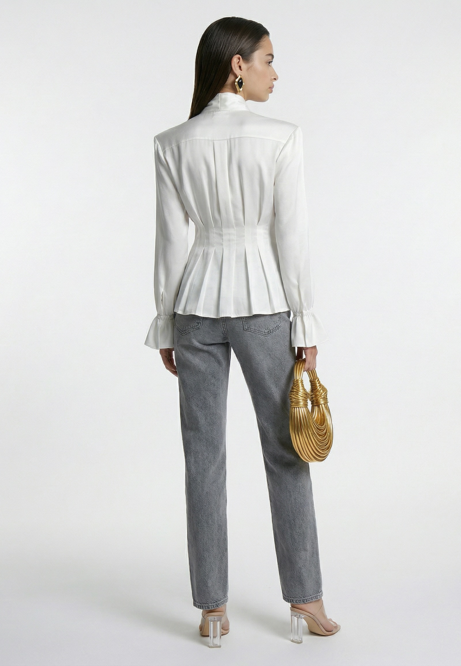 Длинный рукав с мягким объёмом и манжетой. Высокая стойка и длинные завязки, которые можно оставить свободными или оформить узлом. Застёжка на пуговицы спереди.