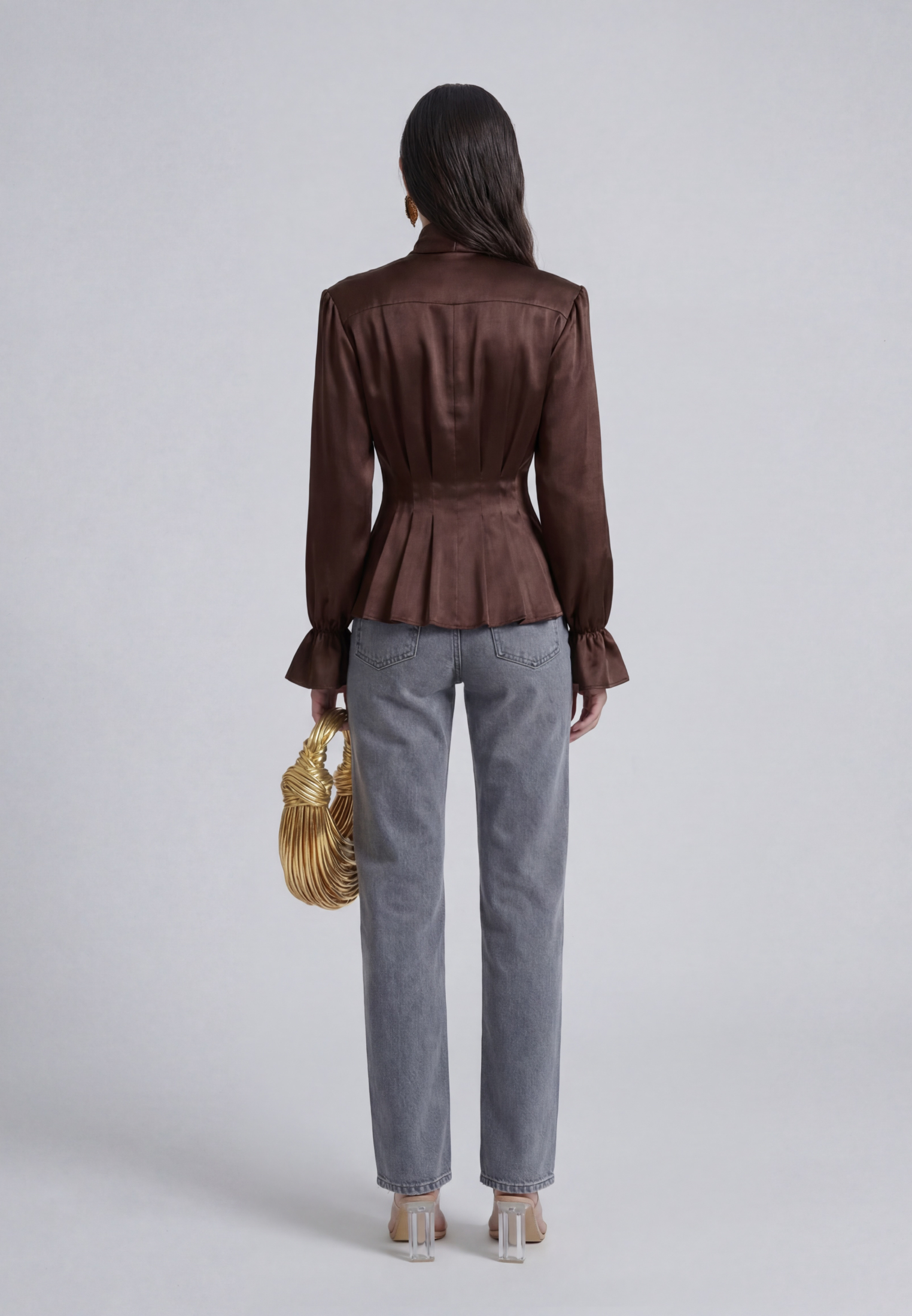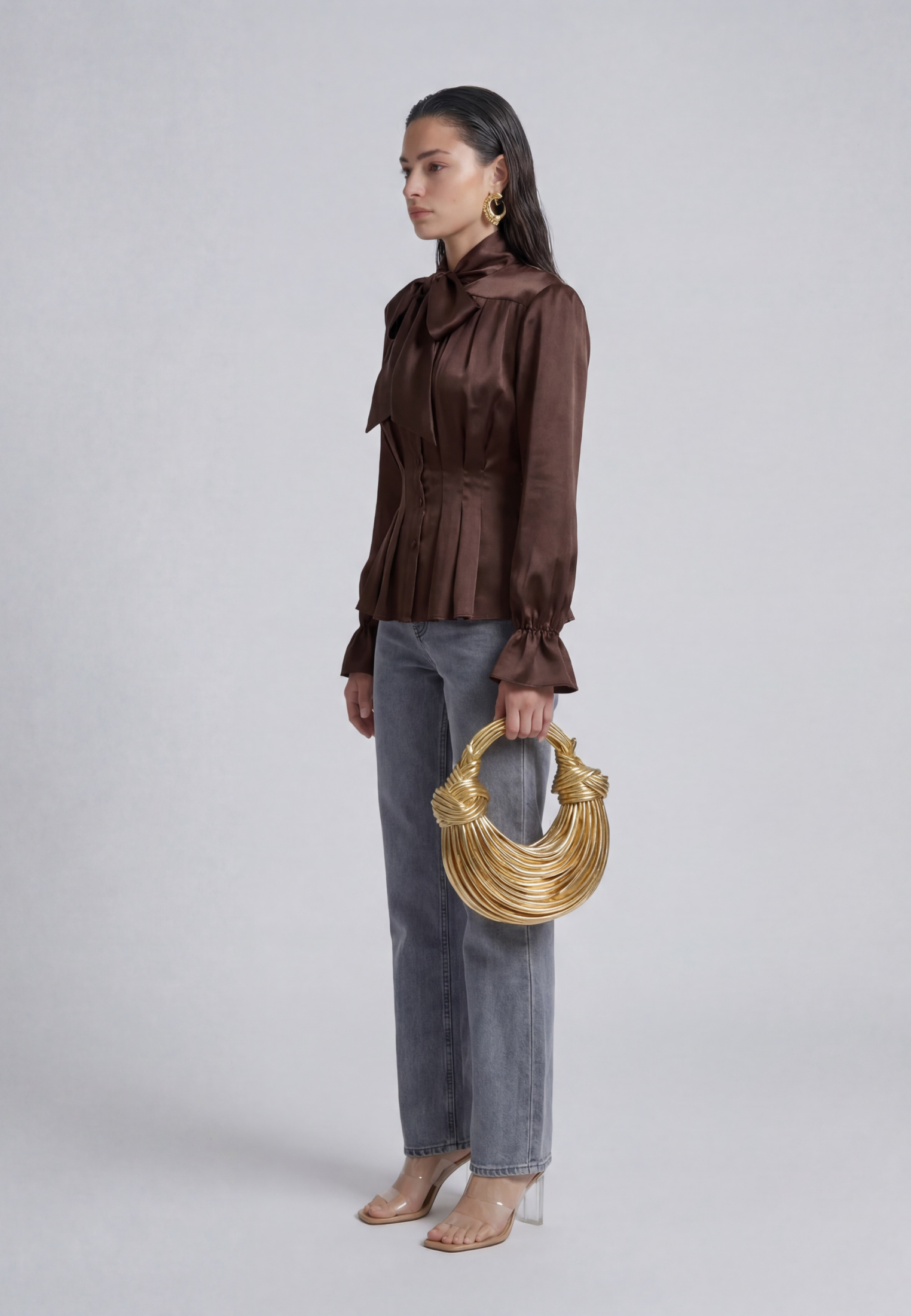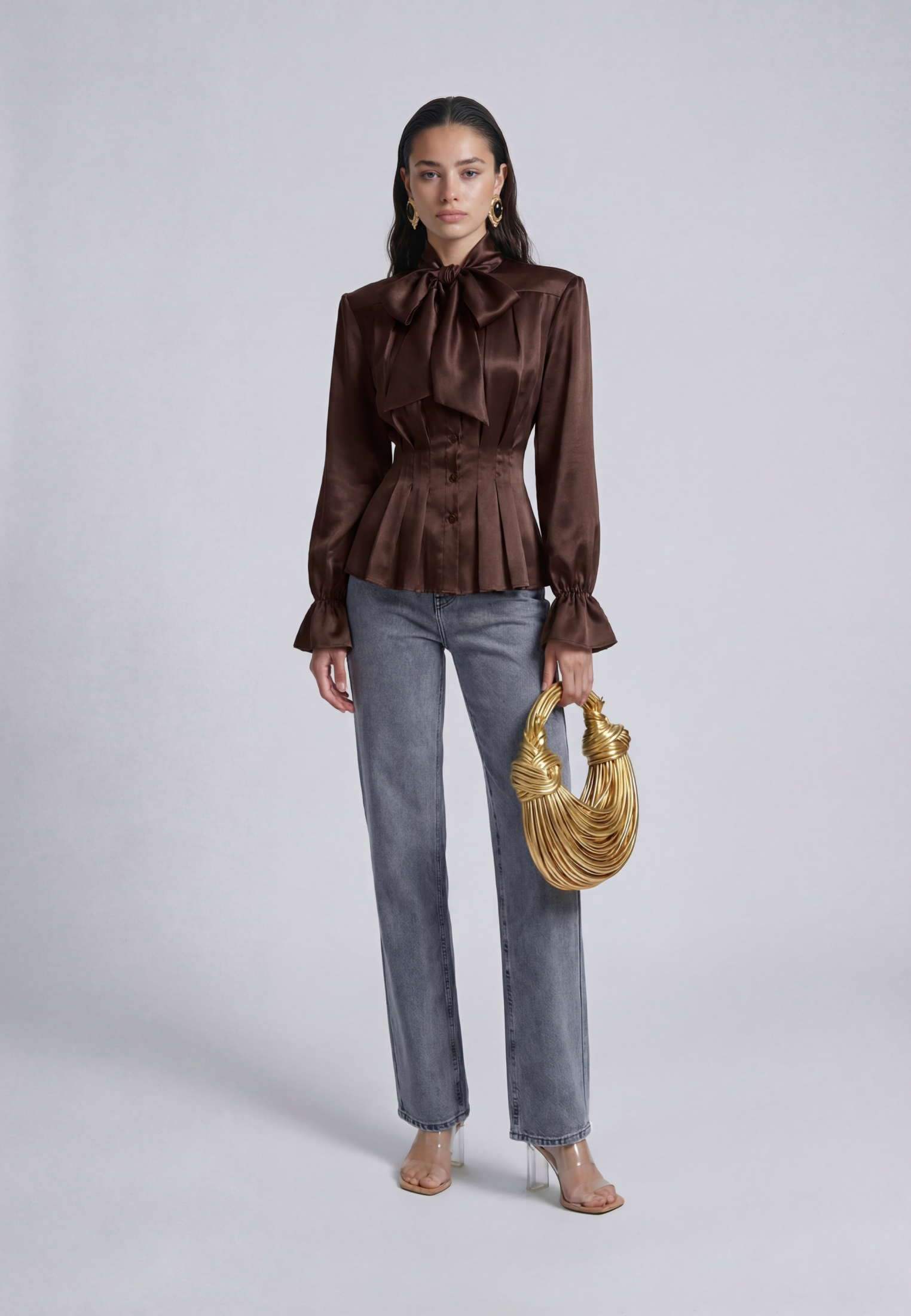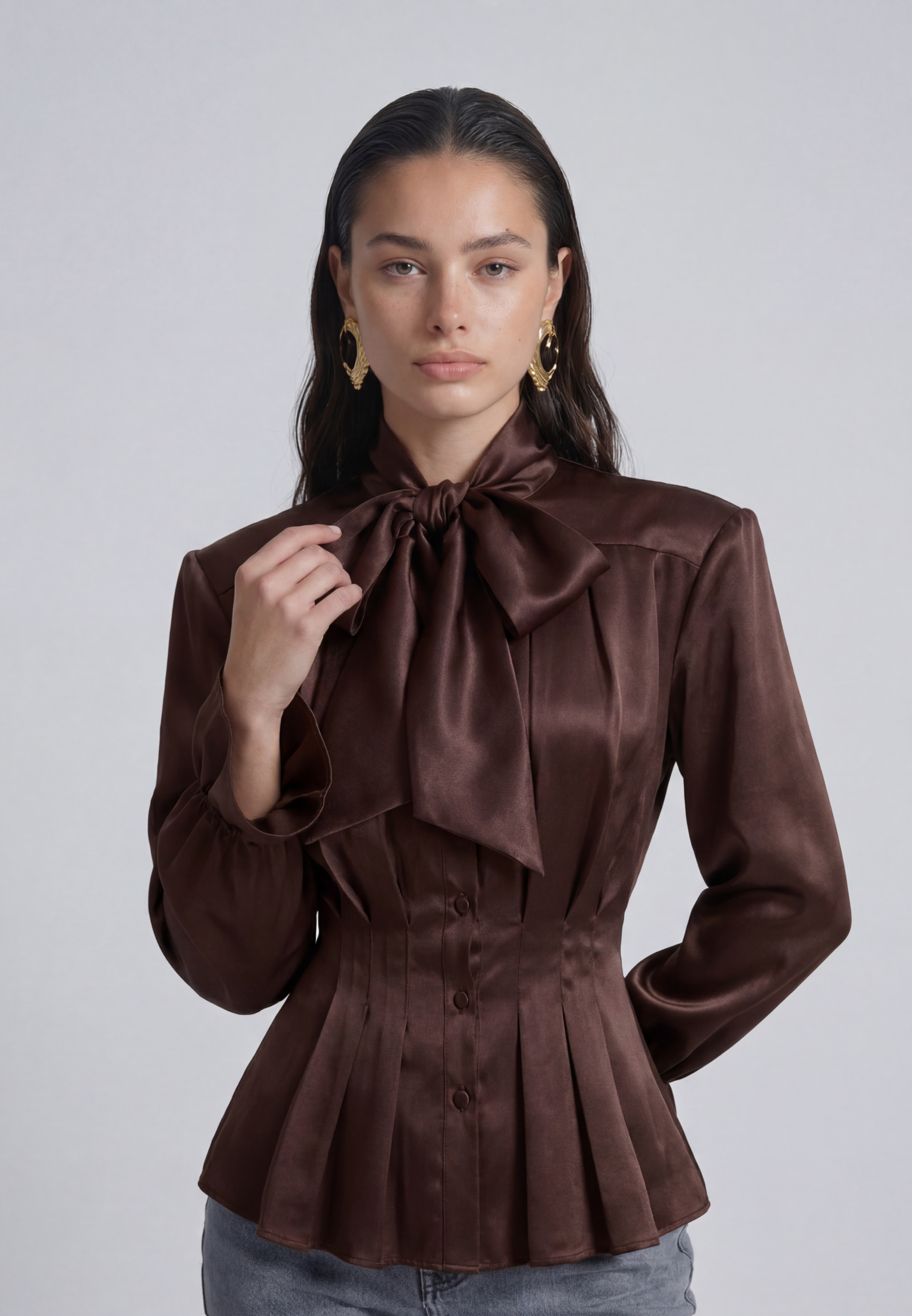 Блузка в шоколадном оттенке с удлинёнными завязками у горловины.