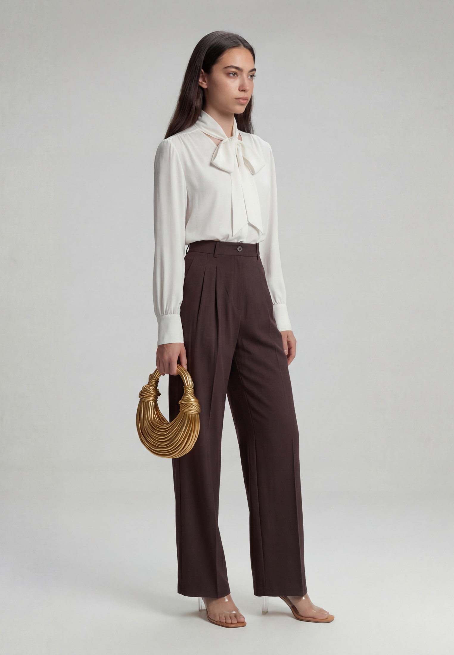 Посадка чётко по линии талии — формирует вытянутый силуэт и аккуратно подчёркивает пропорции. Прямой крой, мягкие складки спереди, свободные по бедру, полной длины, без заужения книзу.