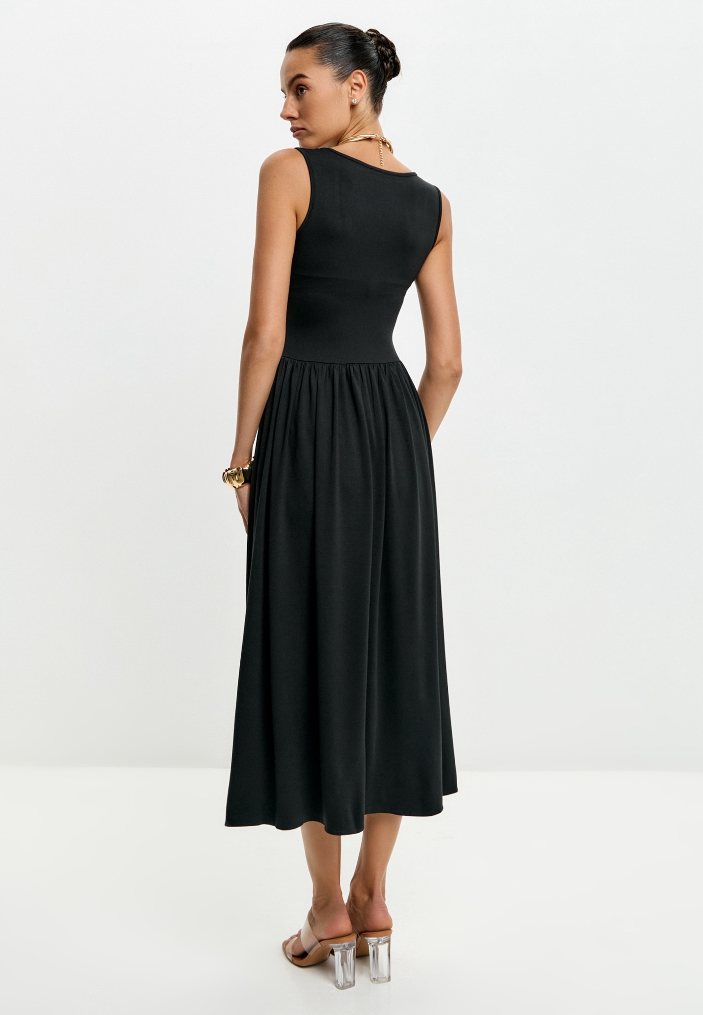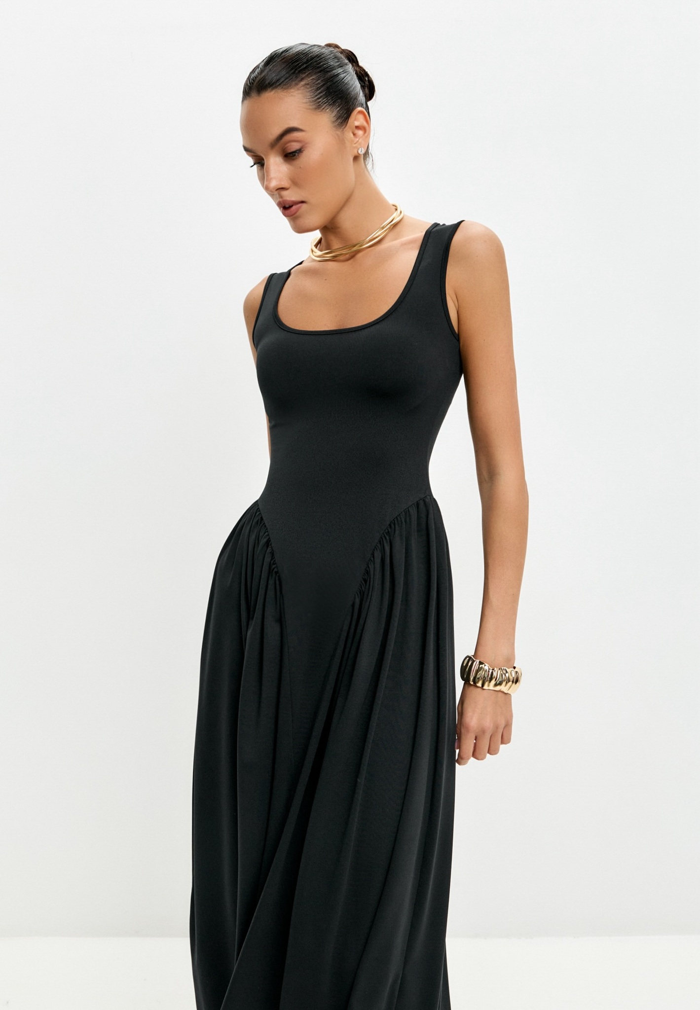 Модель платья с декоративными складками по бокам.