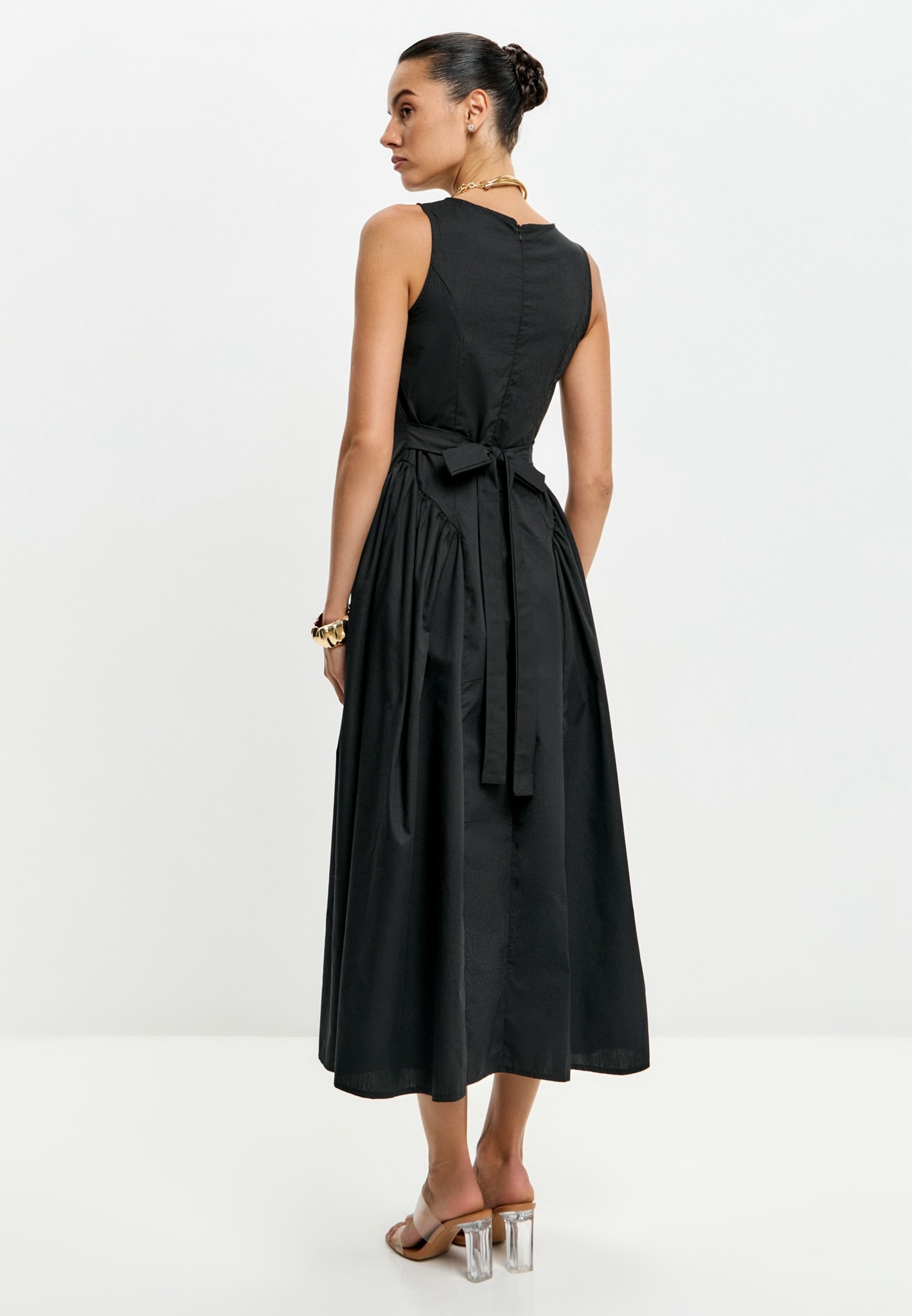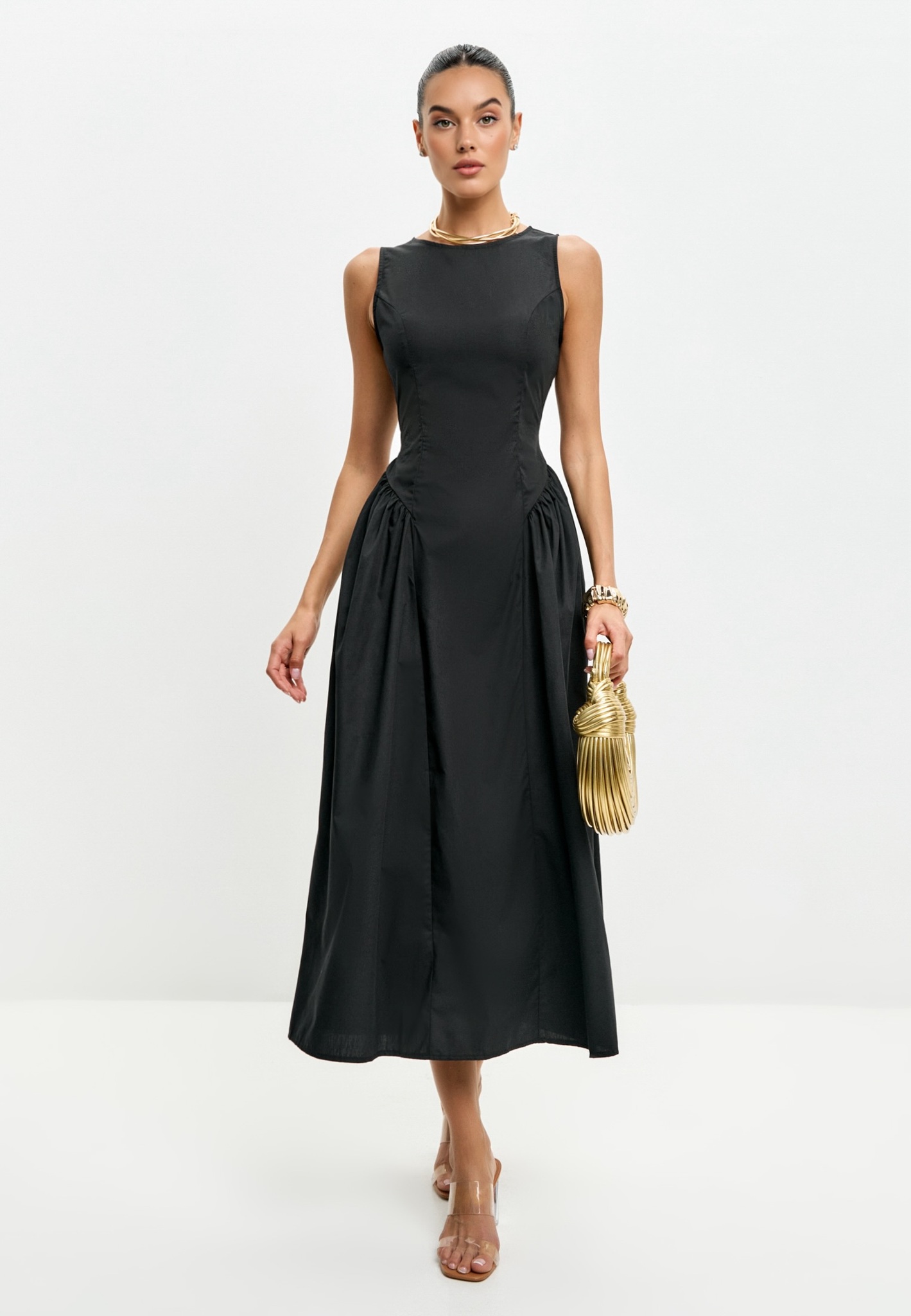 Платье с коротким рукавом и драпировкой с гармоничной, подходящей большинству «французской длиной».