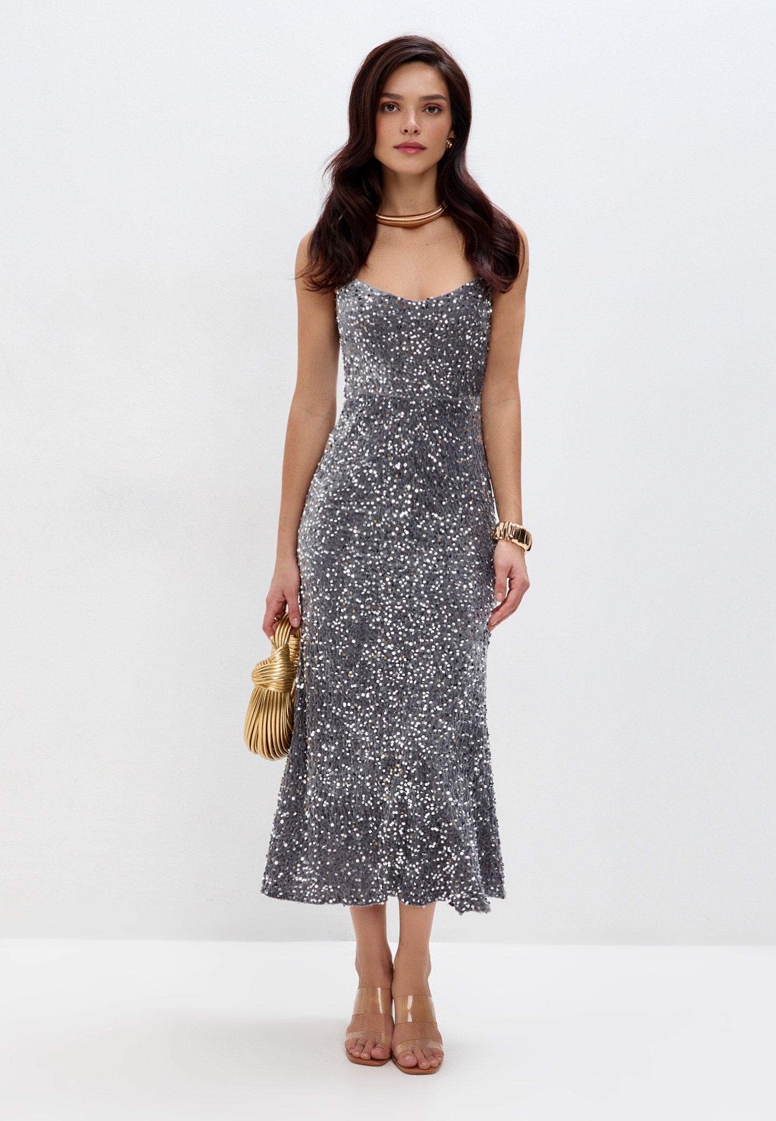 Вечернее платье длины мидакси на бретелях, полностью покрытое пайетками.
