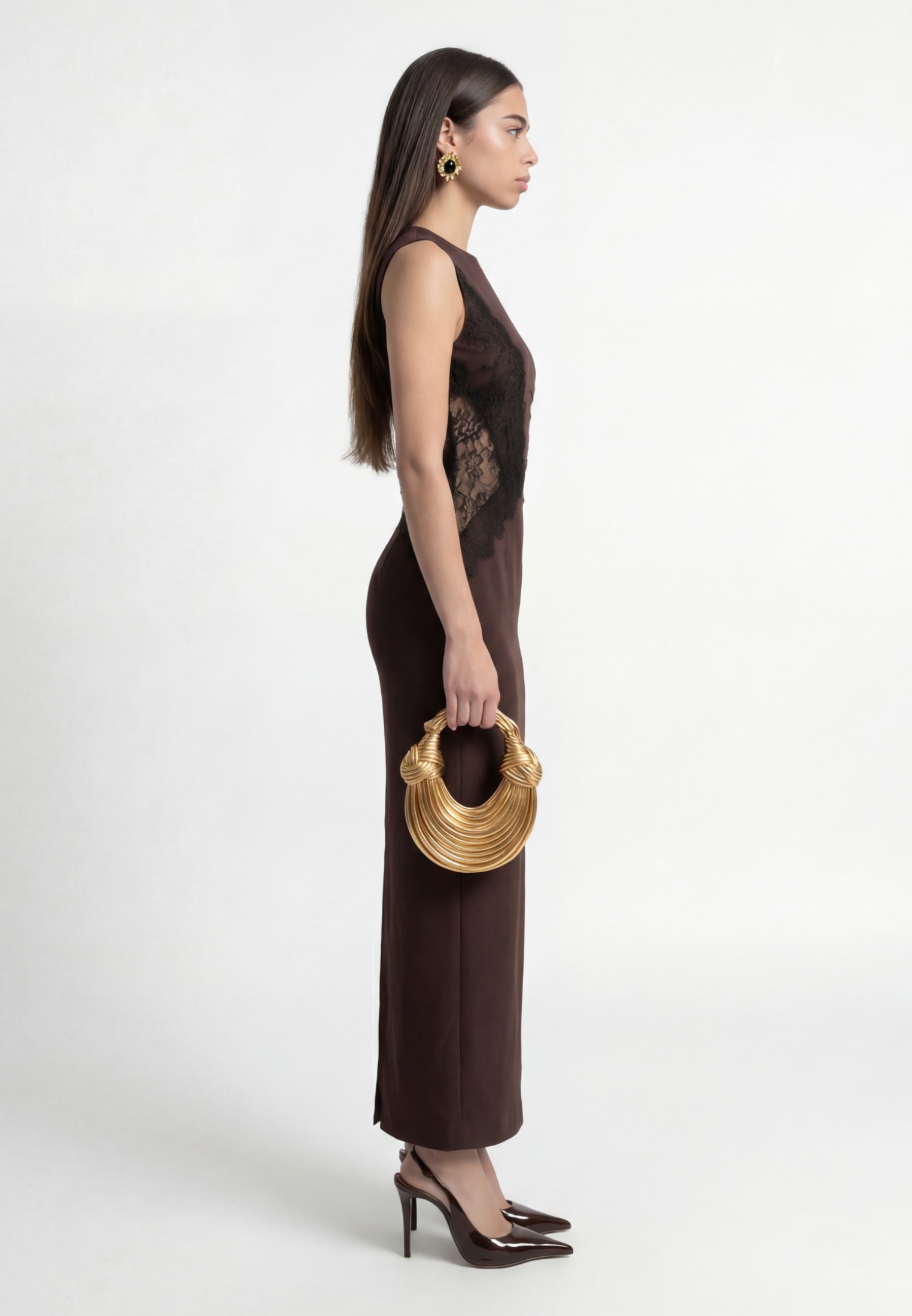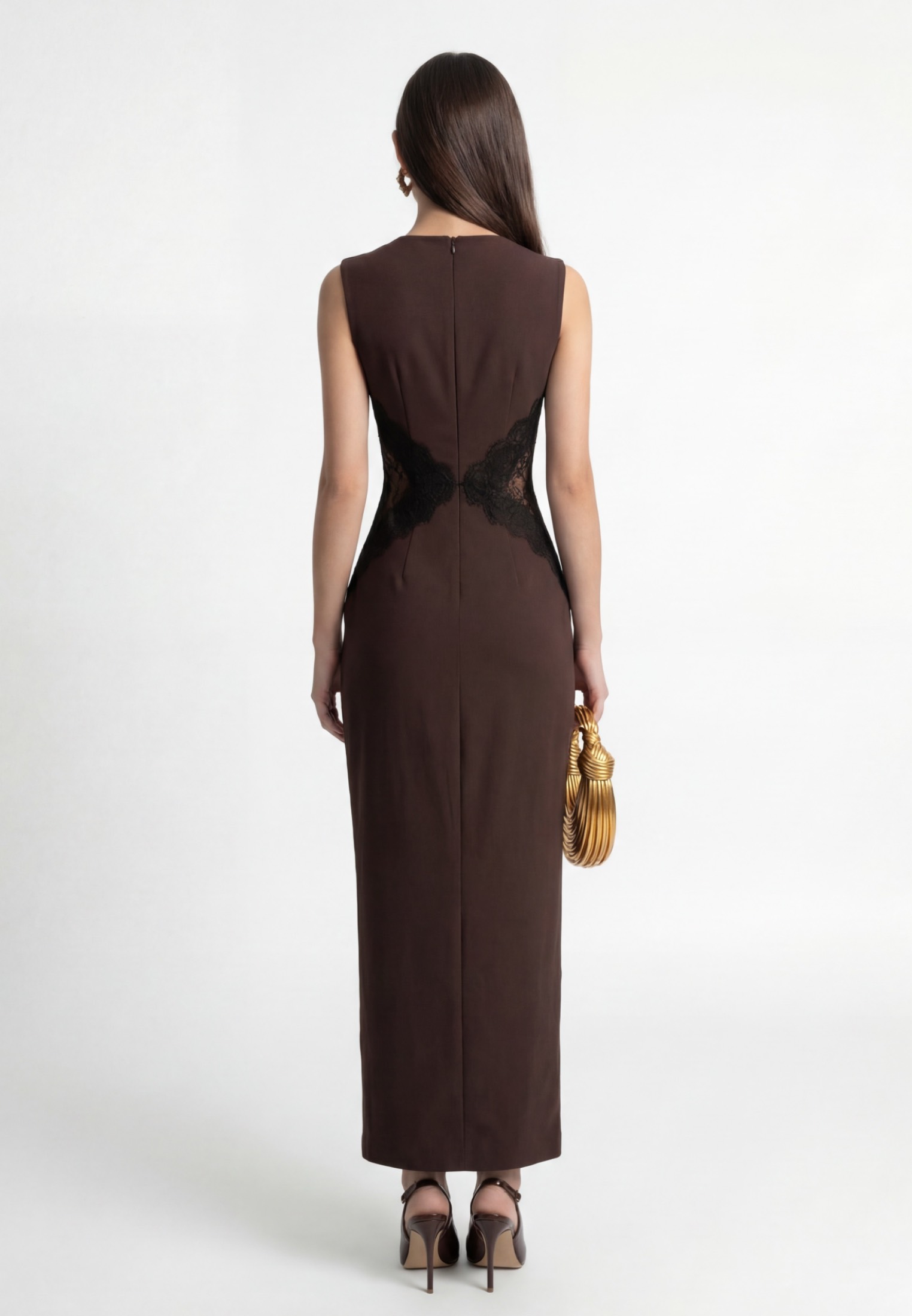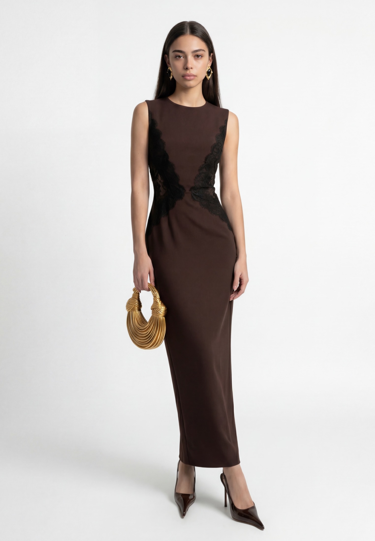 Модель без рукавов с округлой горловиной и чёткой посадкой по плечам. По бокам — кружевные вставки с эффектом прозрачности, визуально подчёркивающие талию и формирующие выразительный силуэт. Застёжка на потайную молнию по спинке. Ткань гладкая, средней плотности, мягко держит форму и аккуратно садится по фигуре.