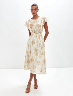 Платье без рукавов «французской длины» в цветочек. Оно имеет приталенный силуэт с поясом, рюши и лиф на пуговицах.