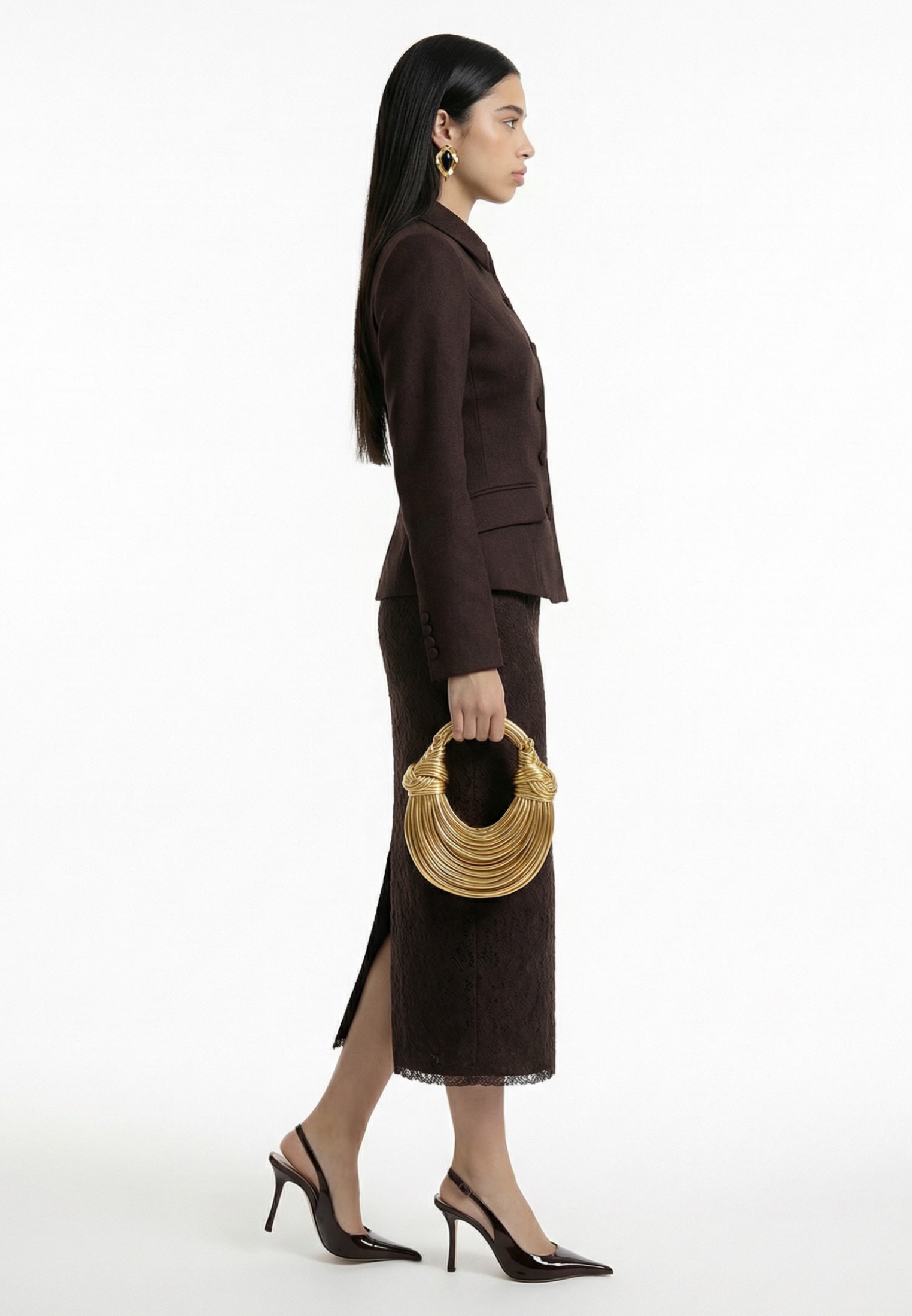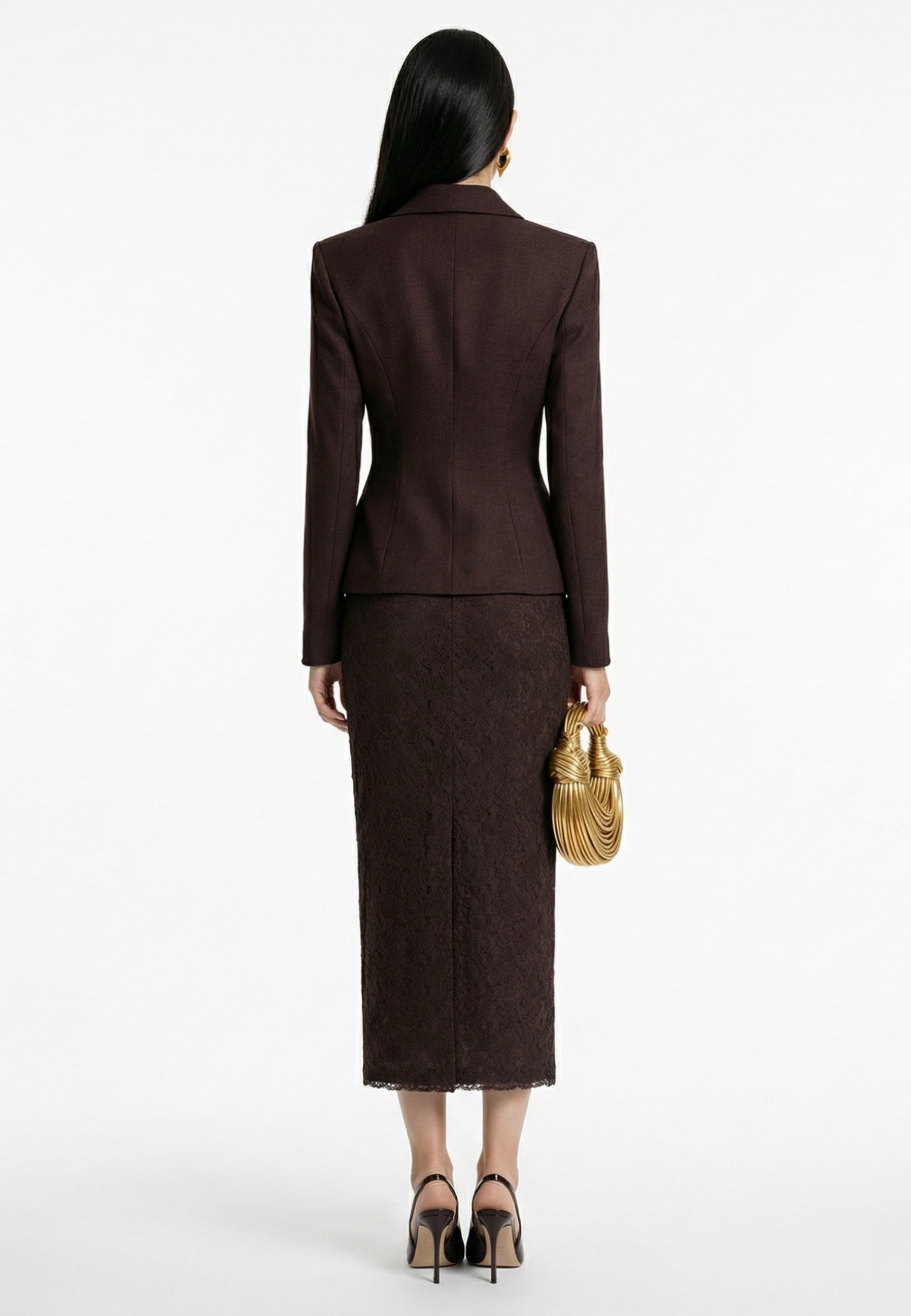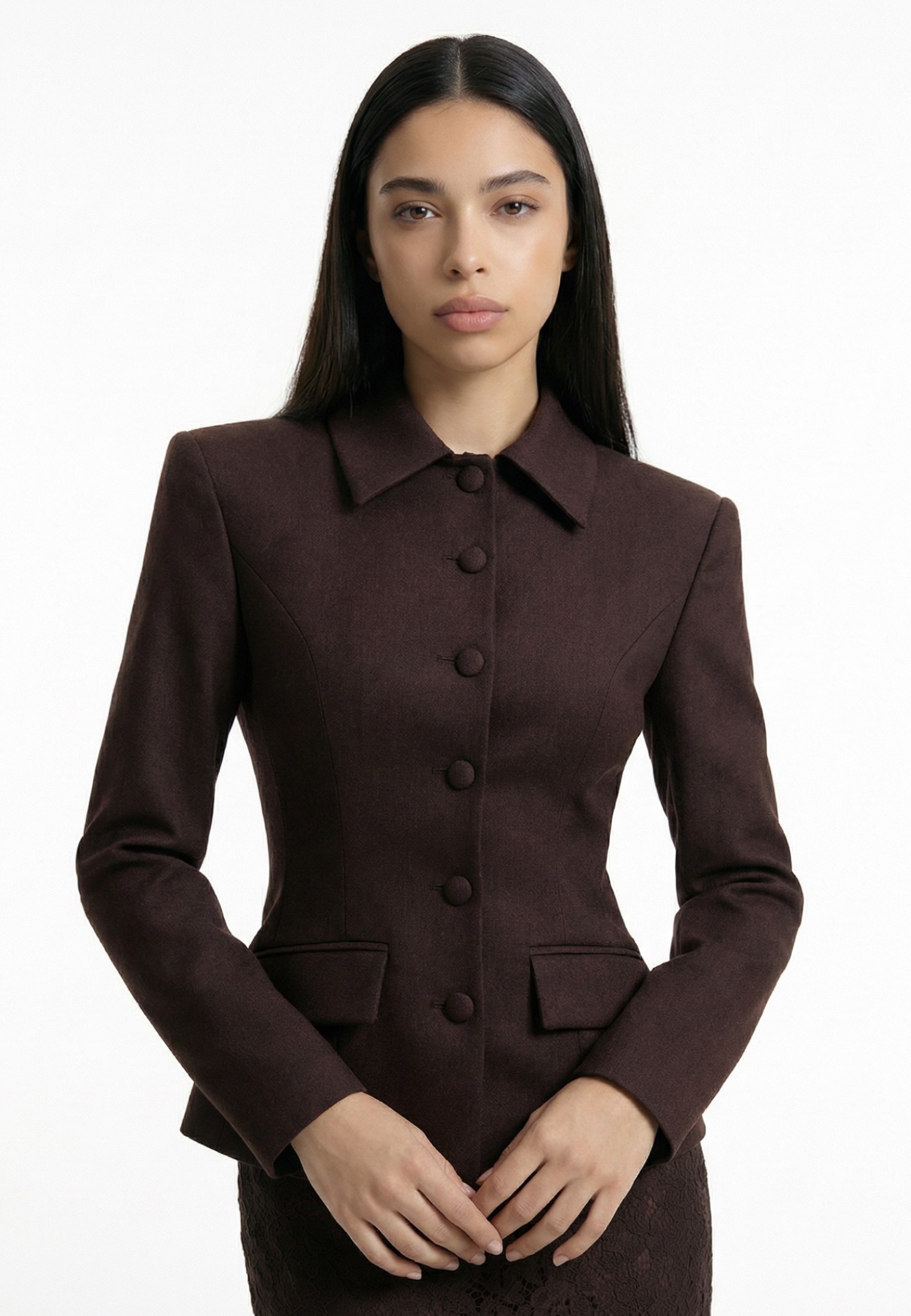 Модель с аккуратным отложным воротником и застёжкой на ряд обтяжных пуговиц. Формирующие рельефы по переду и спинке подчёркивают талию и создают чёткий архитектурный силуэт. Длинный рукав, аккуратные клапаны по линии талии. Выполнен из плотной костюмной ткани, мягко держит форму и обеспечивает точную посадку по фигуре.