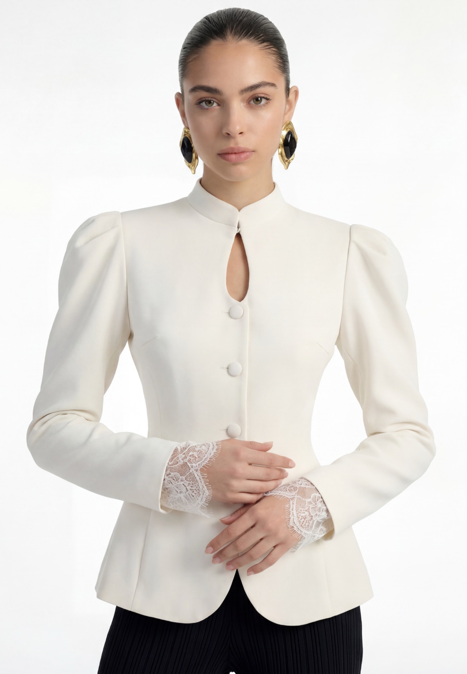 Жакет приталенного силуэта с акцентной линией талии. Выполнен со стойкой и центральной застёжкой на обтяжные пуговицы. Декоративный вырез в области горловины, длинный рукав с лёгким объёмом по окату и кружевной отделкой по низу. Рельефы формируют чёткий, архитектурный силуэт. Ткань костюмная, средней плотности, держит форму и подчёркивает конструкцию изделия.