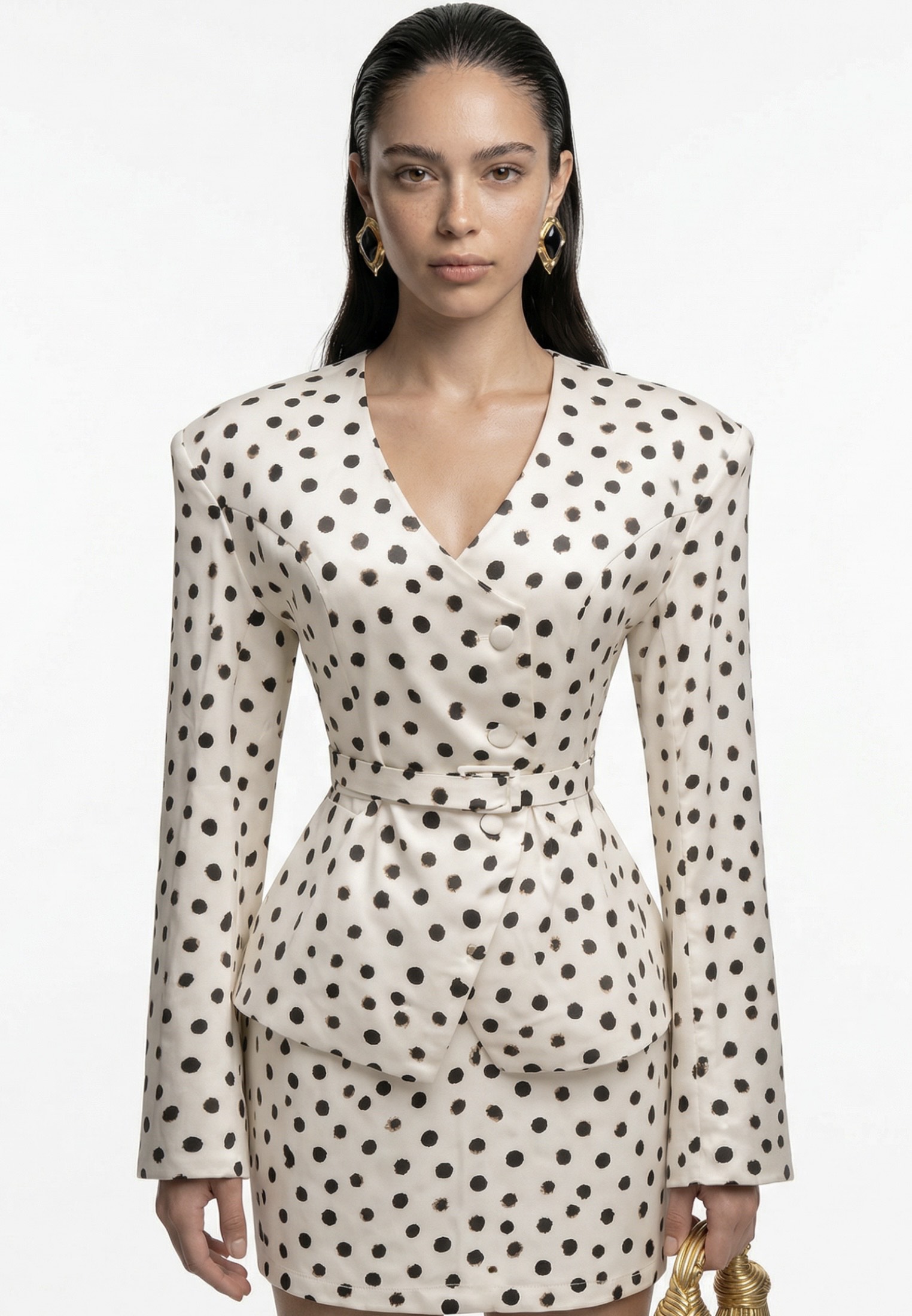 Контрастный принт в горох добавляет образу акцент, сохраняя его элегантность.